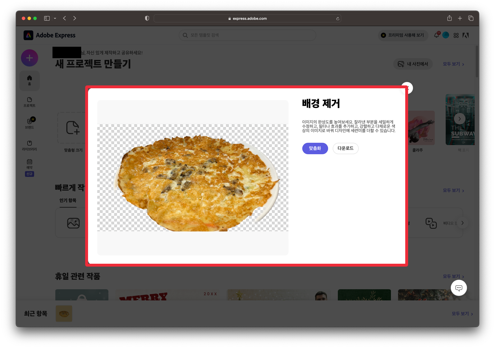 먼저, 무료로 누끼를 딸 수 있는 사이트에는 어도비 익스프레스가 있습니다. 어도비 익스프레스는 로그인만 하면 인터넷 브라우저상에서 무료로 누끼를 딸 수 있는 사이트입니다. 어도비 익스프레스에 접속하신 다음에 로그인을 하시면 위와 같은 화면이 보이실겁니다. 여기에서 [배경 제거]를 눌러주시면 사진의 배경 제거가 가능합니다.
