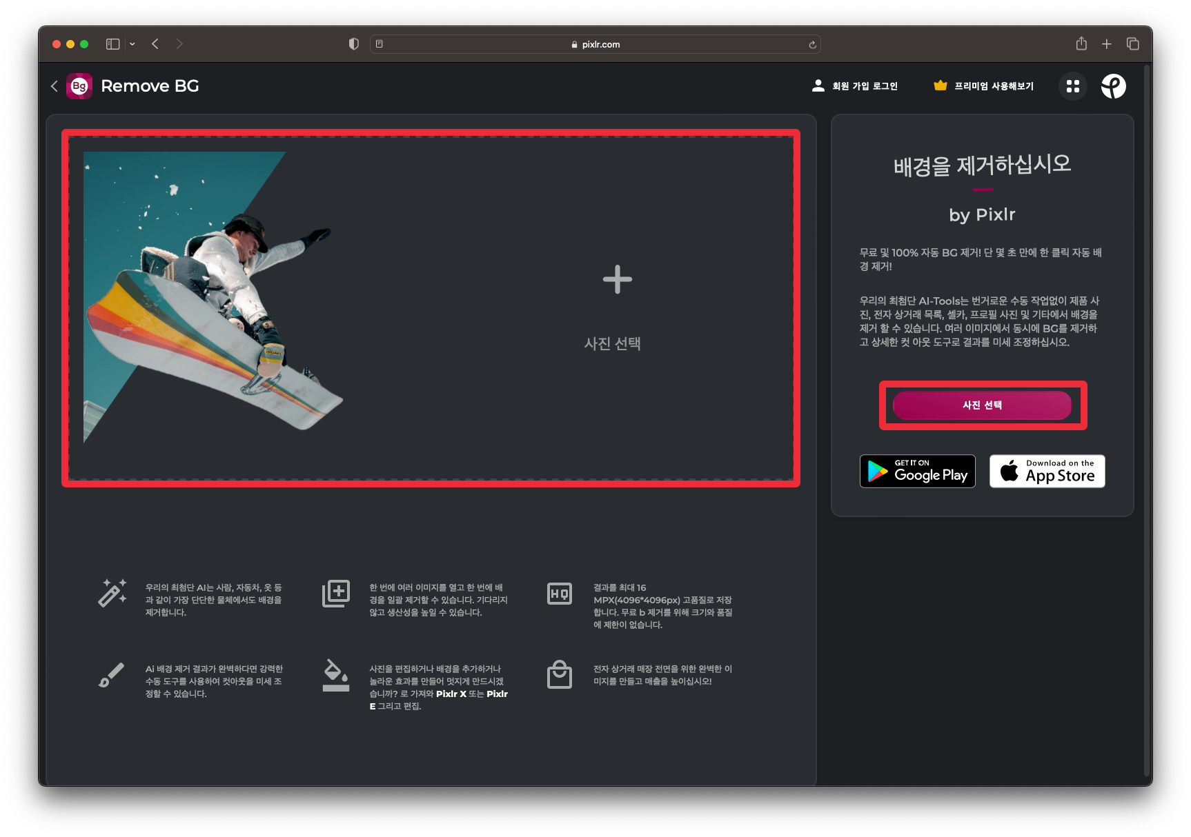 다음으로 소개해드릴 사이트는 픽슬러입니다. 픽슬러는 이미 사진 편집으로 유명한 사이트인데 이 픽슬러에서도 누끼따기가 가능합니다. 픽슬러에서 제공해주는 배경제거 사이트에 접속하시게 되면 위와 같이 보이실겁니다. 여기에서 [사진 선택]을 눌러서 배경을 제거하고자 하는 사진을 선택해주시면 됩니다.
