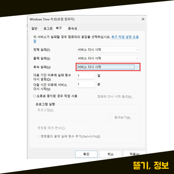 그러고 나서 [복구] 탭을 눌러주신 다음에 [후속 실패] 항목을 확인해 주시면 됩니다. 기존에 보시면 후속 실패 항목이 [동작하지 않음]으로 설정이 되어있는데, [서비스 다시 시작]으로 변경해 주시면 됩니다. 정리를 하자면, 후속 실패 항목을 동작하지 않음에서 서비스 다시 시작으로 바꿔주세요.