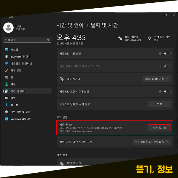 만약 윈도우의 시간을 빠르게 다시 설정하고 싶으신 경우에는 [추가 설정] 영역에 위치해 있는 [지금 동기화] 기능을 사용할 수 있습니다. [지금 동기화]를 하게 되면 시간 서버 time.windows.com와 날짜 및 시간이 바로 동기화가 되면서 맞춰지게 됩니다. 날짜 및 시간이 시간 서버와 실시간 동기화가 되는 겁니다.
