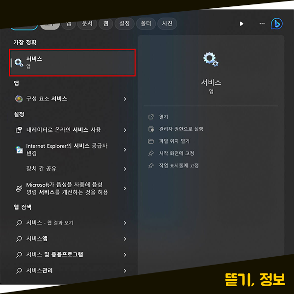 이렇게 여러 방법을 통해서 윈도우 시간 설정을 했음에도 불구하고 계속해서 컴퓨터의 시간이 맞지 않은 경우에는 추가로 다른 설정을 하나 해보도록 하겠습니다. 먼저, [서비스] 설정 창을 찾아서 열어주세요.