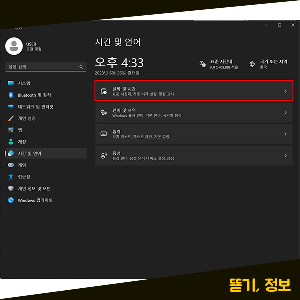 그러고 나서 이제 [날짜 및 시간] 메뉴를 클릭해 주세요. [날짜 및 시간] 메뉴에서 자동 시계 설정부터 표준 시간대, 일정 표시 등 여러 날짜 및 시간에 관련된 설정들을 할 수 있습니다. [날짜 및 시간] 메뉴를 클릭해주세요.
