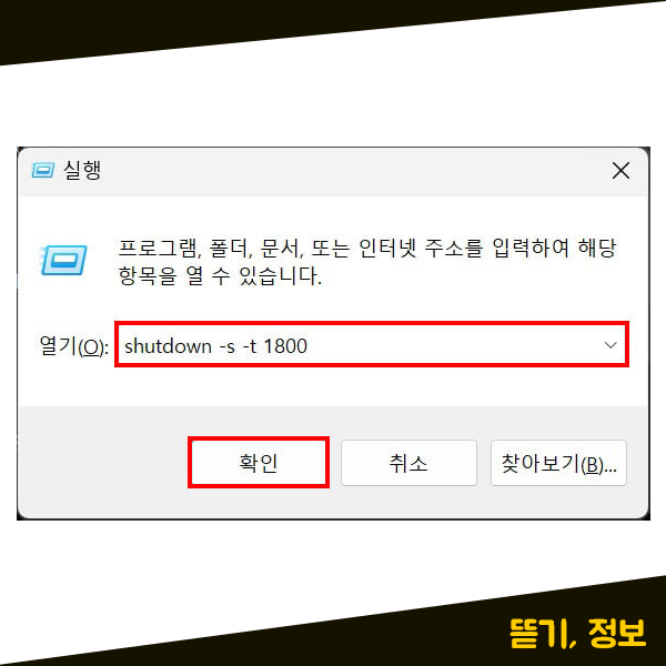 위와 같이 초 단위로 시간을 계산하신 다음 shutdowon -s -t 시간으로 컴퓨터 자동 종료 명령어를 입력하신 후, 하단에 있는 [확인] 버튼을 눌러주세요. 저는 [shutdown -s -t 1800]으로 입력을 했고, 컴퓨터가 설정한 시간으로부터 30분 후에 자동으로 종료 되도록 예약을 해보겠습니다.