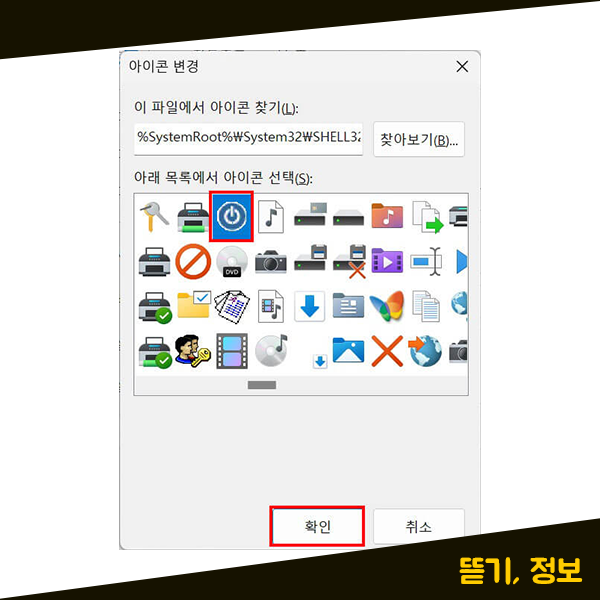 아이콘 변경 버튼을 눌러주시게 되면 위와 같이 [아이콘 변경] 창이 나타납니다. 보시면 수많은 아이콘 이미지들이 있는데, 여기에서 자동 종료와 잘 어울리고 비슷한 아이콘을 찾아서 선택해 주시면 됩니다. 저는 전원 버튼 모양의 아이콘 이미지를 찾아서 선택해보도록 하겠습니다. 원하시는 아이콘 이미지를 선택하신 다음 하단에 있는 [확인] 버튼을 눌러주세요.