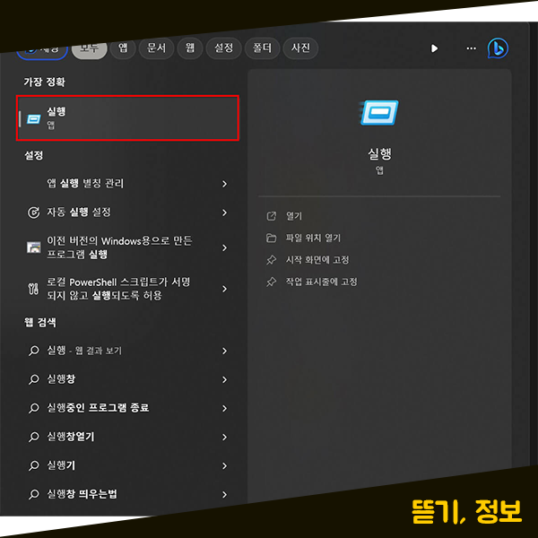 윈도우 컴퓨터 자동 종료는 [실행] 앱을 통해서 쉽게 설정 할 수 있습니다. 자동 종료를 설정하기 위해 먼저, 실행 앱을 실행해 주셔야 합니다. [실행] 앱은 [윈도우 키 + R]을 눌러서 바로 [실행]을 열어주셔도 되고, 위와 같이 윈도우에서 [실행]이라고 검색하신 후 나오는 [실행]을 열어주셔도 됩니다. 위와 같이 실행 창을 열어보시면 실행창 가운데에 텍스트를 입력할 수 있는 공간이 있는데 여기에 컴퓨터 자동 종료를 위한 명령어를 입력해주시면 됩니다. 명령어를 입력해주시면 컴퓨터 자동 종료 예약이 되는데 명령어를 입력해보도록 하겠습니다.