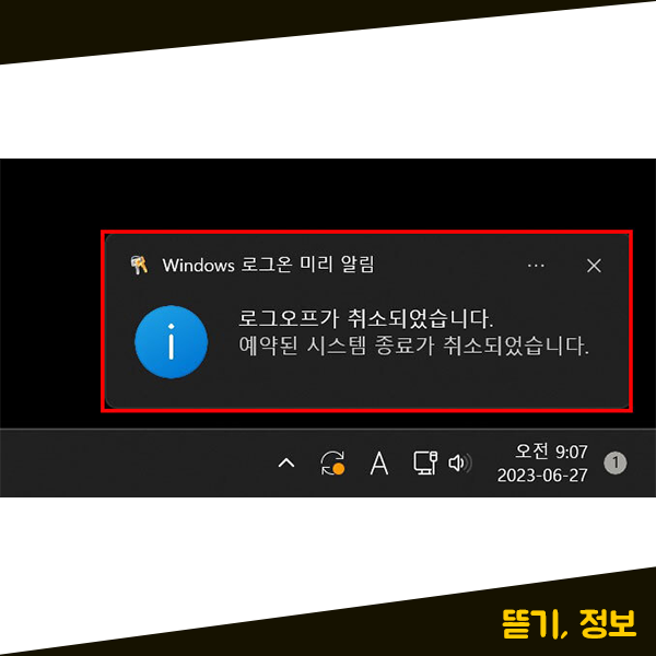 윈도우 컴퓨터 자동 종료 예약이 취소가 되면 자동 종료 예약 설정과 마찬가지로 작업표시줄 바로 위에 윈도우 로그오프가 취소되었다는 알림이 나타납니다. 그럼 윈도우 자동 종료 예약이 정상적으로 잘 해제된 것을 다시 한 번 확인할 수 있습니다.