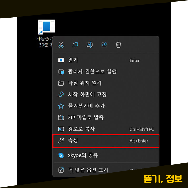 바로 가기 아이콘을 변경해 주시면 위와 같이 이전과는 다르게 새롭게 바뀐 아이콘으로 표시 되는 것을 볼 수 있습니다. 처음 생성된 바로가기 아이콘 이미지보다는 좀 더 자동 종료에 비슷한 아이콘으로, 저 바로 가기가 자동 종료와 관련된 바로 가기인지 바로 알아볼 수 있습니다.