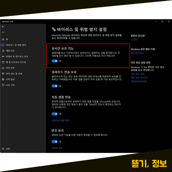 윈도우에서는 디펜더 보안 기능을 쉽게 키고 끄고 뿐만 아니라 예외 처리 설정도 가능합니다.