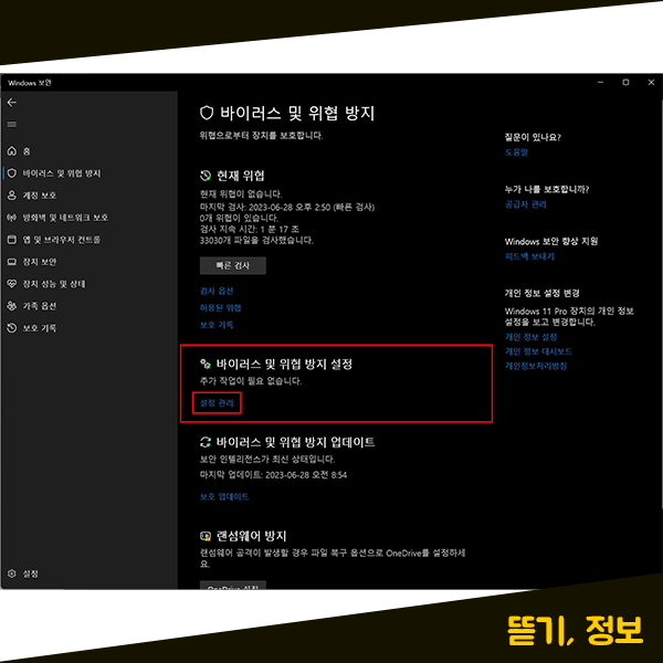 그럼 이렇게 바이러스 및 위협 방지 설정 페이지로 들어오게 됩니다. 여기에서는 이제 가운데 영역에 위치한 [바이러스 및 위협 방지 설정] 영역을 확인해 주시면 되는데요. 바이러스 및 위협 방지 설정에 있는 [설정 관리] 항목을 눌러주세요.