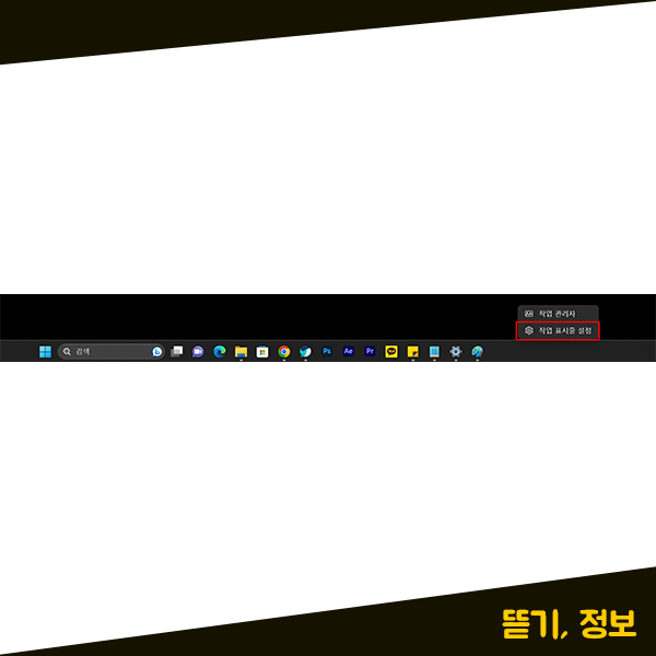 이 작업표시줄 설정 화면까지 여러 단계를 거쳐서 들어왔는데요. 하지만 이 설정 화면까지 여러 단계를 거치지 않고 다이렉트로 들어올 수 있는 방법이 하나 있습니다. 바로, 윈도우 작업표시줄에 마우스를 올린 상태로 우측 마우스를 클릭하시면 위의 화면과 같이 2개의 메뉴가 나타납니다. 여기에서 [작업 표시줄 설정] 메뉴를 눌러주시면 지금까지 거쳐온 과정을 건너뛰고 바로 작업표시줄 설정 화면으로로 이동하게 됩니다. 하지만 이런 방식은 현재 윈도우 작업표시줄이 숨김 처리가 되어 있는 상태이거나 먹통이 된 상태에서는 접근이 어려울 수도 있습니다.