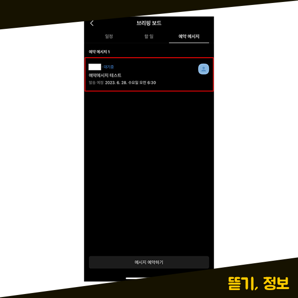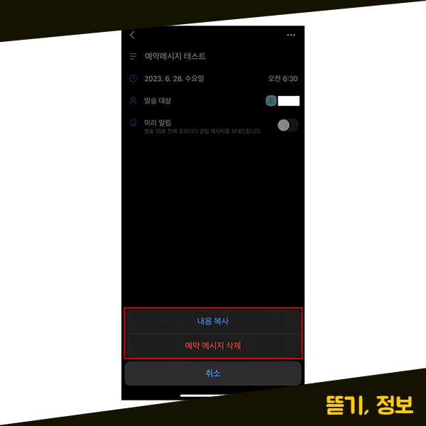 만약 예약 메시지가 발송되기 전에 한 번 알림을 받고 싶으시다면, 미리 알림을 알림 받지 않음이 아닌 알림 받음으로 설정해주시면 됩니다. 그러면 예약 메시지가 발송되기 15분 전에 메시지가 발송이 될 거라는 알림을 받아볼 수 있습니다.