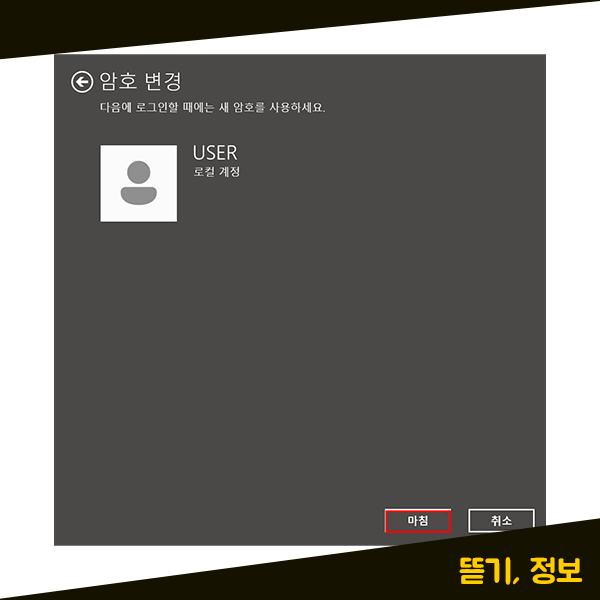 그럼 이제 윈도우 비밀번호 변경이 완료되게 되는데요. 하단에 마침 버튼을 눌러주시면 됩니다. 비밀번호 변경이 완료되었기 때문에 다음 윈도우 로그인부터는 새로 설정하신 비밀번호로 로그인 하시면 됩니다. 비밀번호를 변경하고 싶으실 때에는 이렇게 비밀번호를 변경해주시면 됩니다.