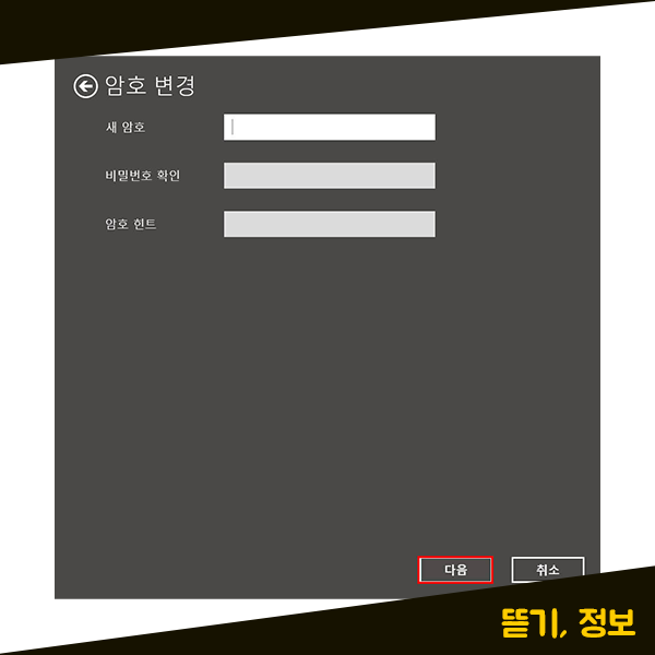 다음으로 암호 변경하고자 하는 새 암호를 입력하는 화면이 나타나실 텐데요. 이제 여기에서 다르게 설정 해주셔야 합니다. 더이상 윈도우 비밀번호를 설정하고 싶지 않을 때, 윈도우 비밀번호를 해제 하고 싶으시다면 모든 입력란을 공백으로 비워두시면 됩니다. 입력란에 아무것도 입력하지 않은 곻백 상태로, 하단에 있는 다음 버튼을 눌러주세요.