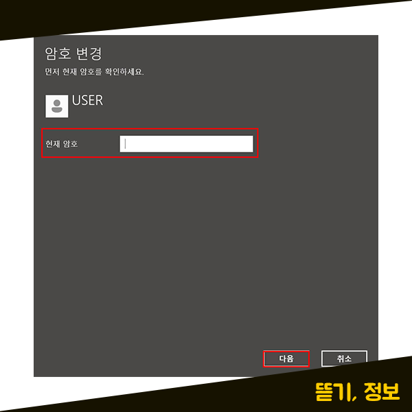 [변경] 버튼을 눌러주시면 암호 변경 화면이 나타나실 텐데요. 먼저, 현재의 윈도우 암호를 입력하신 후 하단에 있는 [다음] 버튼을 눌러주세요.