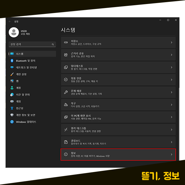 설정 창을 열어주신 다음 [시스템] 설정 화면에서 화면을 제일 아래로 내려주시면 됩니다. 그러면 윈도우 가상 메모리 설정을 할 수 있는 [정보] 메뉴가 있습니다. [정보] 메뉴를 찾아서 클릭해주세요.