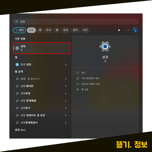 먼저, 윈도우11 가상 메모리를 설정하기 위해서 설정 앱을 찾아서 열어주세요. 가상 메모리 설정을 통해 여러 단계를 타고 들어가야 하는데 제일 먼저 설정 앱을 열어주시면 됩니다.