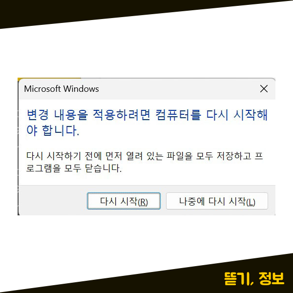 방금 새롭게 설정한 윈도우11 가상 메모리를 적용하려면 컴퓨터를 다시 시작해주셔야 하는데요. 모든 속성 창을 다 닫으시면 위와 같이 컴퓨터를 다시 시작해야 한다는 창이 나타납니다. 여기에서 [다시 시작]을 눌러서 컴퓨터를 다시 시작해 주시게 되면, 이제 변경된 윈도우 가상 메모리로 가상 메모리 설정이 완료됩니다.