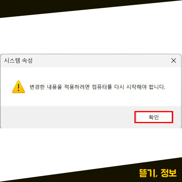 위와 같이 가상 메모리를 설정해 주시게 되면 변경한 내용을 적용하려면 컴퓨터를 다시 시작해야 합니다 라는 알림 창이 나타나게 되는데요. 여기에서 확인을 눌러주시고, 다른 속성 창들도 확인을 누르신 다음 닫아주시면 됩니다.