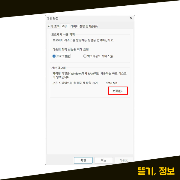 설정 버튼을 눌러주시면 성능 옵션 창이 나타나실 텐데요. 여기에서 [고급] 탭으로 들어오신 후, 가상 메모리 영역을 확인해 주시면 됩니다. 가상 메모리 영역에 있는 [변경] 버튼을 눌러서 윈도우 가상 메모리 크기를 수정할 수 있는데요. 가상 메모리 크기를 수정함으로써 가상 메모리를 확보하게 되면 당장 급한 윈도우 메모리 부족 현상을 해결할 수 있게 됩니다. 그럼 윈도우 메모리 부족 현상을 해결하기 위해서 가상 메모리 영역에 있는 [변경] 버튼을 눌러보도록 하겠습니다.
