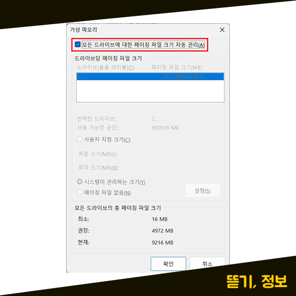 그럼 위와 같이 가상 메모리 속성 창이 나타나실 텐데요. 현재 제일 상단에 있는 모든 드라이브에 대한 페이징 파일 크기 자동 관리 항목이 체크되어 있습니다. 저희는 가상 메모리를 직접 설정하기 위해서 모든 드라이브에 대한 페이징 파일 크기 자동 관리 항목을 체크 해제해 주셔야 합니다. 모든 드라이브에 대한 페이징 파일 크기 자동 관리를 체크 해제해 주세요.