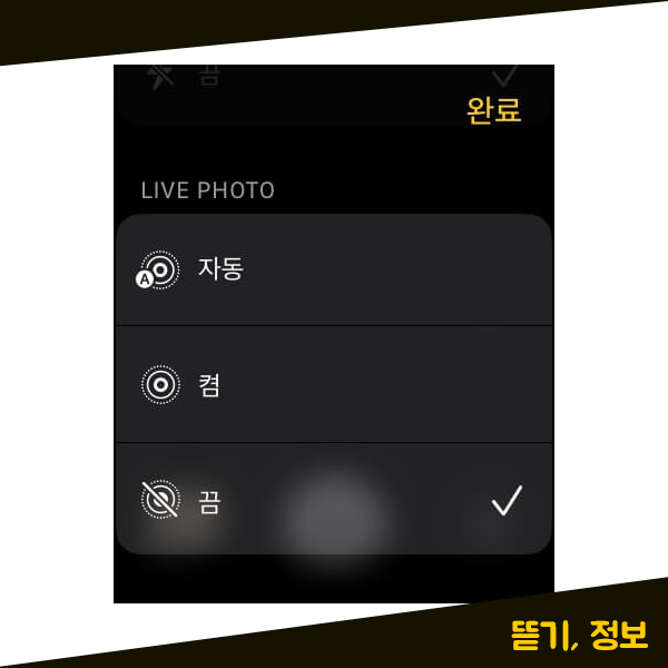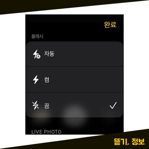 LIVE PHOTO에 대한 설정도 할 수 있는데요. 아이폰에서는 움직이는 사진을 찍을 수 있게끔 라이브 포토 기능을 제공해 주고 있는데 이 LIVE PHOTO에 대한 설정도 애플워치에서 가능한데요. 자동, 켬, 끔으로 아이폰 라이브 포토 설정을 해주시면 됩니다.