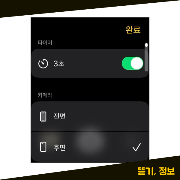그럼 애플워치에서 설정 화면이 나타납니다. 애플워치에서 타이머는 기본적으로 3초 타이머가 설정되어 있습니다. 만약 타이머 설정 없이 셔터를 누르는 순간 바로 촬영을 하고자 하신다면 이 타이머 기능을 비활성화로 꺼주시면 됩니다. 그리고 사진 촬영하고자 하는 카메라를 선택할 수 있습니다. 전면 카메라로 촬영할 것인지, 후면 카메라로 촬영할 건지 선택 가능한데요. 사진을 찍으려고 멀리 둔 아이폰을 후면 카메라 모드에서 셀카 모드로 바꾸고 싶으실 때에는 애플워치만으로도 카메라 모드 변경이 가능합니다.
