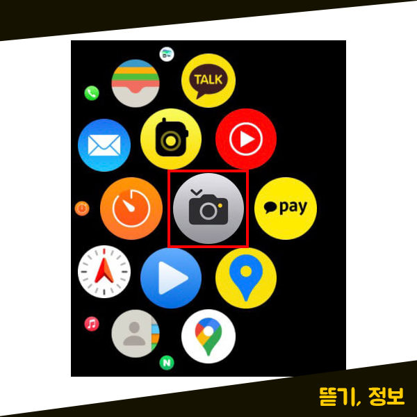 먼저, 애플워치를 카메라 리모컨으로 사용하기 위해서는 애플워치와 아이폰이 서로 연결되어 있는 상태여야 하는데요. 애플워치에 연결된 아이폰의 카메라로 사진을 찍기 위해서 애플워치와 아이폰을 준비해주세요. 그런 다음, 애플워치를 잠금 해제 하신 후 앱 목록에서 [카메라] 앱을 찾아주시면 됩니다. 애플워치 카메라 앱에서 카메라 셔터 기능을 사용할 수 있습니다. 카메라 앱을 눌러서 애플워치로 카메라 사진을 찍어보겠습니다.