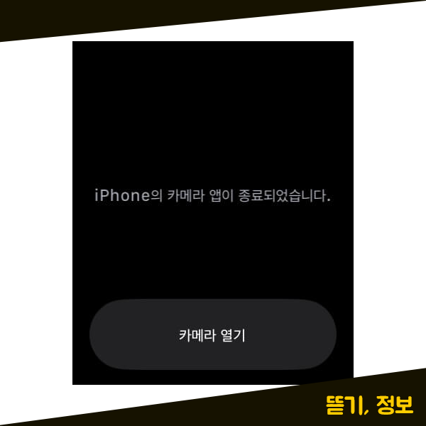 참고로 애플워치를 이용해서 카메라 촬영을 하려고 했지만 아이폰에서 카메라 앱을 벗어나면, 애플워치 화면에서 iPhone의 카메라 앱이 종료되었습니다라고 표시가 됩니다. 이런 경우에는 화면 하단에 있는 카메라 열기 버튼을 눌러주시면 되는데요. 아이폰에서 카메라 앱을 벗어났기 때문에 카메라 사진 촬영이 불가능해졌기 때문에 위와 같이 나타난건데요. 그래서 애플워치에 하단에 있는 [카메라 열기] 버튼을 통해 아이폰에서 카메라를 다시 열어주시면 사진 촬영이 가능합니다.