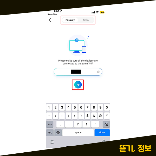 아이폰에서 오른쪽 상단에 있는 Passkey 입력을 누르신 다음, Passkey를 입력하시고 나서 윈도우 노트북과 연결을 할 수 있습니다. 화면 미러링은 passkey로 연결이 가능하고, qr코드로 연결 가능하기 때문에 편하신 방법으로 사용하시면 됩니다.