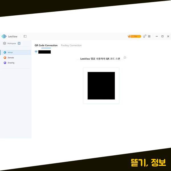 윈도우 노트북에서 LetsView 프로그램을 실행하시면 위와 같은 화면으로 나타나고, QR코드와 Passkey 메뉴로 2가지가 제공됩니다. 여기에서 먼저, LetsView 앱을 이용해서 QR 코드 스캔을 할 수 있는 QR코드가 제공되고 있습니다.