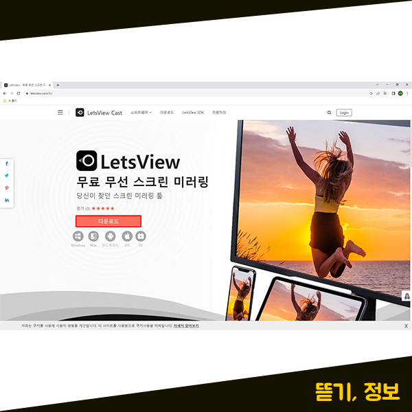 먼저, 윈도우 노트북에서 아이폰 화면 미러링 기능을 사용하기 위해서 아이폰과 노트북에 프로그램을 하나씩 설치해 주셔야 합니다. 윈도우 노트북부터 프로그램을 설치해 보겠습니다. 윈도우에서 검색 브라우저를 열어주신 후, [LetsView]를 검색하신 후 해당 웹홈페이지에 접속해주시면 위와 같은 화면이 보이실 겁니다. 그럼 화면 가운데에 [다운로드] 버튼이 보이실 텐데요. 이 [다운로드] 버튼을 눌러서 무료 무선 스크린 미러링 프로그램을 다운로드 받으신 후, 설치를 진행해 보도록 하겠습니다.