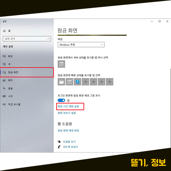 개인 설정 메뉴를 눌러주시면 위와 같이 설정 화면이 열립니다. 여기에서 왼쪽에 보시면 여러 설정 메뉴들이 있는데 노트북 화면이 자동으로 잠금 화면 상태가 되지 않게끔 설정하기 위해서 [잠금 화면] 메뉴를 눌러주시면 되는데요. [잠금 화면] 메뉴를 눌러주시면 오른쪽에 노트북 잠금 화면을 설정할 수 있는 화면이 나타납니다. 잠금화면 설정화면으로 들어오신 다음, 화면을 제일 하단으로 내려주시면 [화면 시간 제한 설정] 메뉴가 있습니다. 이 [화면 시간 제한 설정] 메뉴를 눌러보도록 하겠습니다.