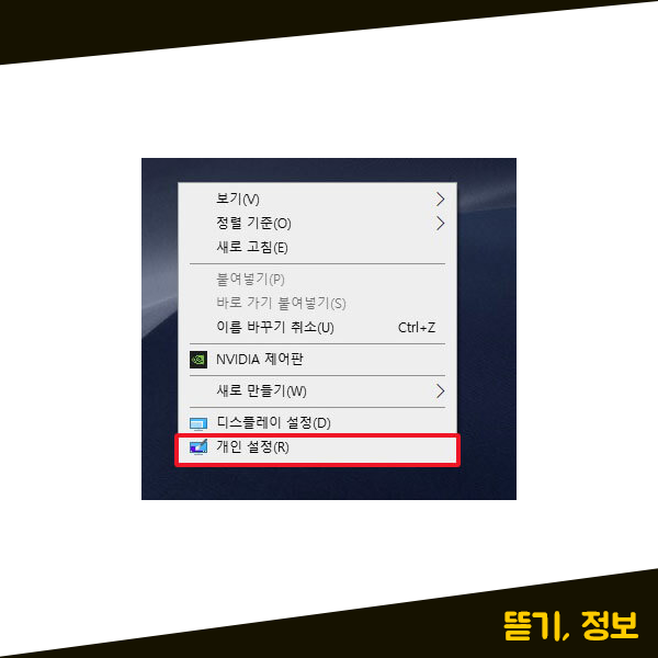 설정을 하기 위해서 노트북 바탕화면에서 오른쪽 마우스를 클릭해주세요. 우측 마우스를 클릭해 주시면 메뉴창이 하나 나타나는데 여기에서 제일 하단에 있는 [개인 설정] 메뉴를 눌러주세요.