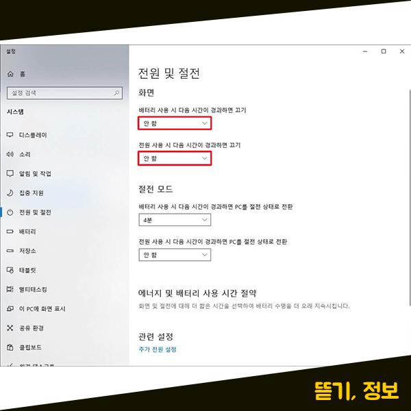 잠깐이라도 노트북을 사용하지 않을 때, 노트북 화면이 자동으로 꺼지는 것이 불편하셨다면 이렇게 노트북 전원 및 절전 설정을 통해서 오랜 시간 동안 노트북을 사용하지 않더라도 화면이 계속해서 켜져 있게끔 설정 가능합니다.