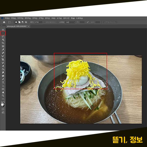 다음으로는 포토샵으로 모자이크를 해보도록 하겠습니다. 포토샵을 실행해 주신 다음에 모자이크 하고자 하는 사진을 열어주시고, 왼쪽에 있는 툴 바를 확인해 주세요. 툴 바에서 2번째에 있는 선택 영역 툴을 선택하신 후, 모자이크 하고자 하는 영역을 선택해 주시면 됩니다.