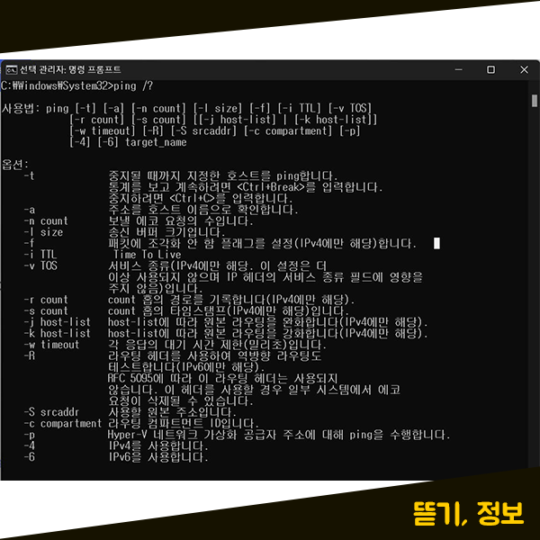 별도의 명령어를 추가해서 핑테스트를 계속할 수 있는데요. ping 명령어를 확인하기 위해서 [ping /?]를 입력해 주시면 ping 명령어에 추가로 사용 가능한 옵션을 확인 가능합니다. 핑테스트를 계속해서 진행하고자 하는 경우에는 옵션으로 [-t]를 추가해 주시면 되고, 중지하고자 하시는 경우에는 [Ctrl+C]를 눌러서 핑테스트를 중지해주시면 됩니다.