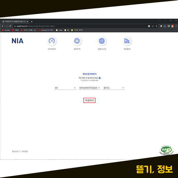 측정 프로그램을 설치 완료하신 다음 다시 NIA 인터넷 품질 측정 사이트로 돌아와 주시면 됩니다. 그럼 위와 같이 보이실텐데요. 여기에서 약관 동의를 해주신 후, 사용하고 있는 인터넷 기지국 통신사와 인터넷 속도, 지역을 선택해 주신 다음 하단에 있는 [측정하기] 버튼을 눌러서 인터넷 속도 측정을 시작해 주시면 됩니다. [측정하기] 버튼을 눌러주세요.