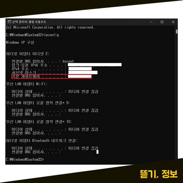 CMD에서 핑테스트를 하기 위해서 먼저 현재 인터넷 네트워크의 게이트웨이 주소를 알아야 합니다. 게이트웨이 주소를 알기 위해서 먼저, [ipconfig] 명령어를 입력해주시면 됩니다. 그러면 위와 같은 화면이 나타나실 텐데요. 여기에서 [기본 게이트웨이] 영역을 확인해 주시면 네 자리 주소가 보이실텐데 이 숫자를 확인해주세요.