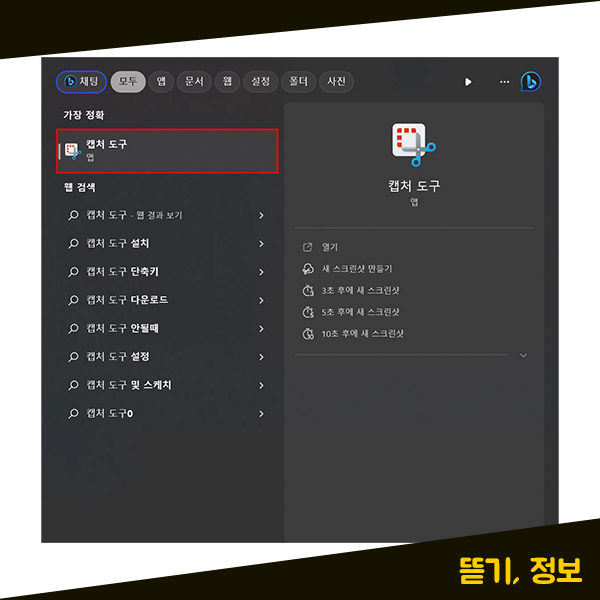 다음으로 사용해볼 방법은 바로 윈도우 캡처 도구를 사용하는 건데요. 아마도 많은 분들께서 이 윈도우 캡처 도구를 많이 사용하실 것 같습니다. 윈도우에서 제공해 주는 기본 캡처 도구로, 다양한 모양의 캡처뿐만 아니라 캡처 후 이미지를 수정할 수 있는 기능도 제공하고 있기 때문에 꽤나 유용한 도구인데요. 먼저, [캡처 도구] 앱을 찾아서 실행해 보도록 하겠습니다.