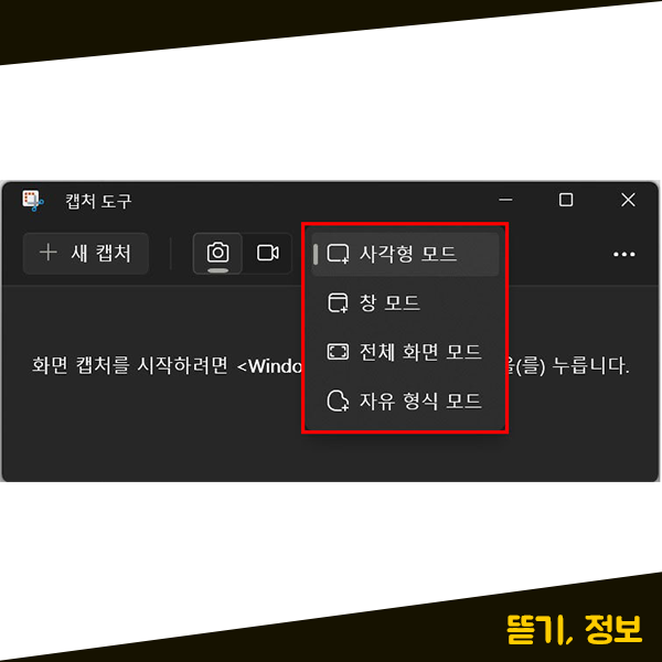 캡처 도구는 여러 많은 기능을 제공해 주고 있는데요. 캡처를 할 때 어떤 형식으로 영역을 지정할지 사각형 모드, 창 모드, 전체 화면 모드, 자유 형식 모드에서 선택할 수 있습니다.