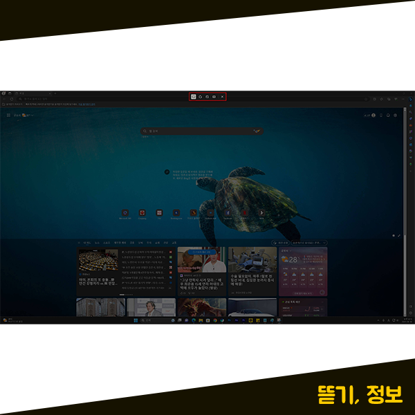새 캡처를 누르시면 위의 화면과 같이 컴퓨터의 화면이 불투명해지면서 제일 상단에는 메뉴가 하나 생긴 것을 볼 수 있습니다. 캡처 도구가 화면을 캡처할 때에는 저렇게 작은 메뉴로 바뀐다고 보시면 되는데요. 여기에서 먼저, 일반 사각형 모양으로 캡쳐를 해보겠습니다.