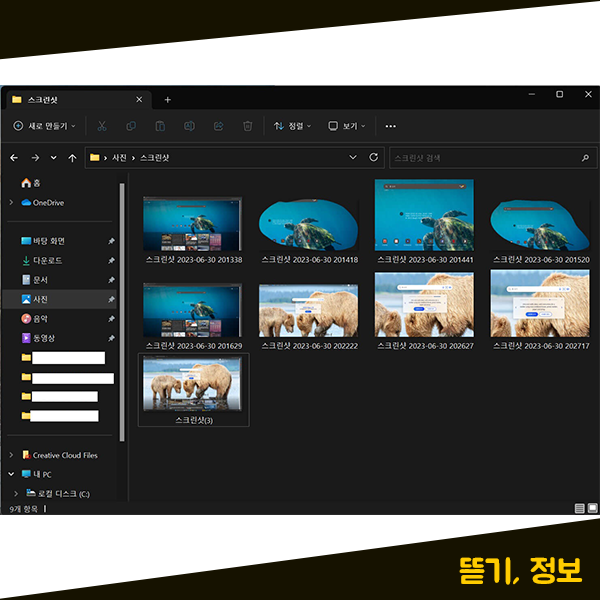 지금까지 저장한 윈도우 스크린샷 화면 캡처본은 어떻게 확인할 수 있을까요? 제 컴퓨터 같은 경우에는 [C드라이브]-[사용자]-[사진 폴더]-[스크린샷] 폴더 안에 지금까지 캡처한 이미지들을 모두 확인할 수 있었는데요. 캡처한 이미지를 확인하고 싶으신 경우 [사진-스크린샷] 폴더를 찾아주시면 되는데요. 참고로, 이 부분은 컴퓨터마다 조금씩 다를 수 있습니다.
