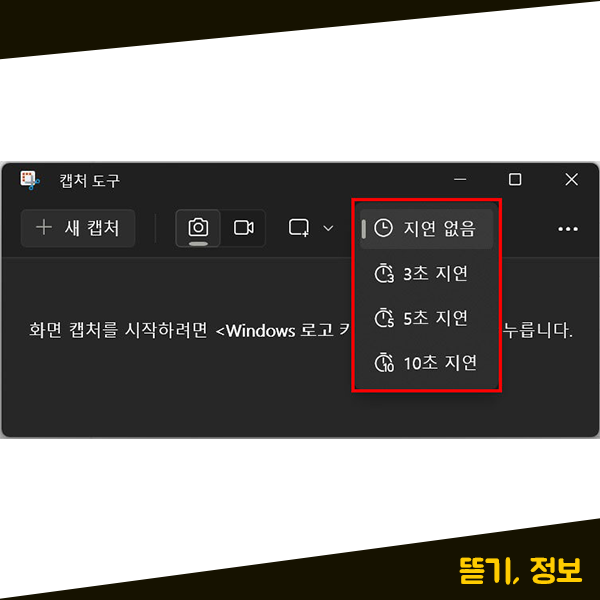 그리고 윈도우 캡처 도구는 타이머 기능도 제공하고 있는데요. 바로 캡처가 가능한 지연 없음부터 3초 지연, 5초 지연, 10초 지연 이렇게 타이머를 제공하고 있습니다.