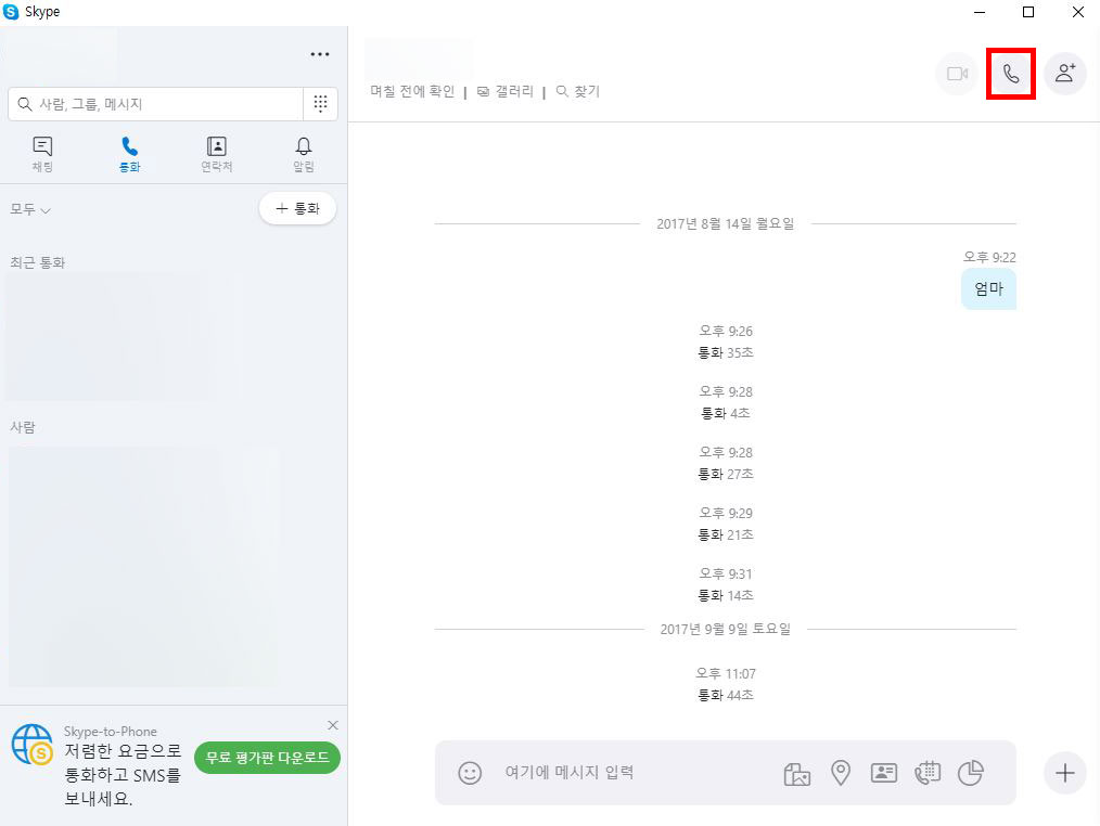 저는 이전에 스카이프에서 통화한 기록이 있었어요. 왼쪽에 통화 메뉴를 클릭하시면 통화기록이 아래에 쭉 나옵니다. 통화기록에 있는 사람을 선택하게 되면 우측에 채팅창처럼 열리는데 채팅창의 우측 상단 전화 아이콘을 누르면 바로 전화가 걸립니다. 전화뿐만 아니라 영상통화나 채팅 등도 가능하다보니 다양한 방법으로 연락을 주고받을 수 있습니다.