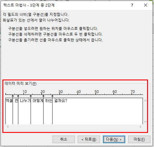 그런 후 각각 필드의 너비를 지정해주시면 됩니다. 필드의 너비는 아래에 있는 [데이터 미리 보기] 영역에서 직접 마우스로 구분선 위치를 옮기면서 조절 가능합니다. 원하는 위치에 마우스를 클릭하시면 구분선이 생기고, 구분선을 마우스로 끌어다가 원하는 위치로 놓으시면서 구분선 조절도 가능합니다.