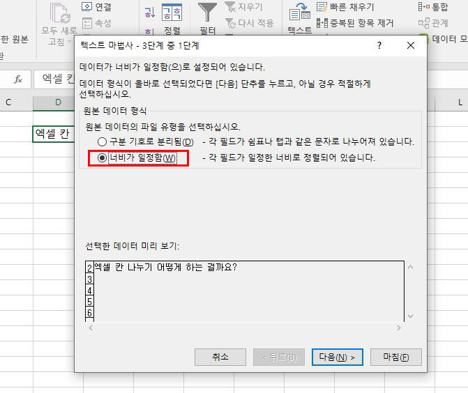 [텍스트 나누기]를 누르시면 [텍스트 마법사] 창이 열립니다. [텍스트 마법사] 창에서 [원본 데이터 형식]은 [너비가 일정함]으로 선택하신 후 다음을 눌러주시면 됩니다.